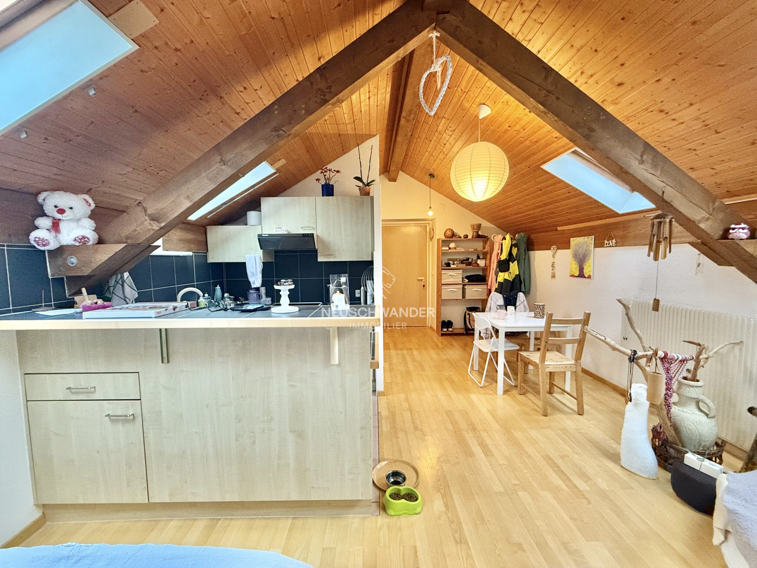 Il est composé d'une cuisine ouverte sur un grand séjour/chambre, une salle d'eau avec douche/WC/lavabo et un réduit.