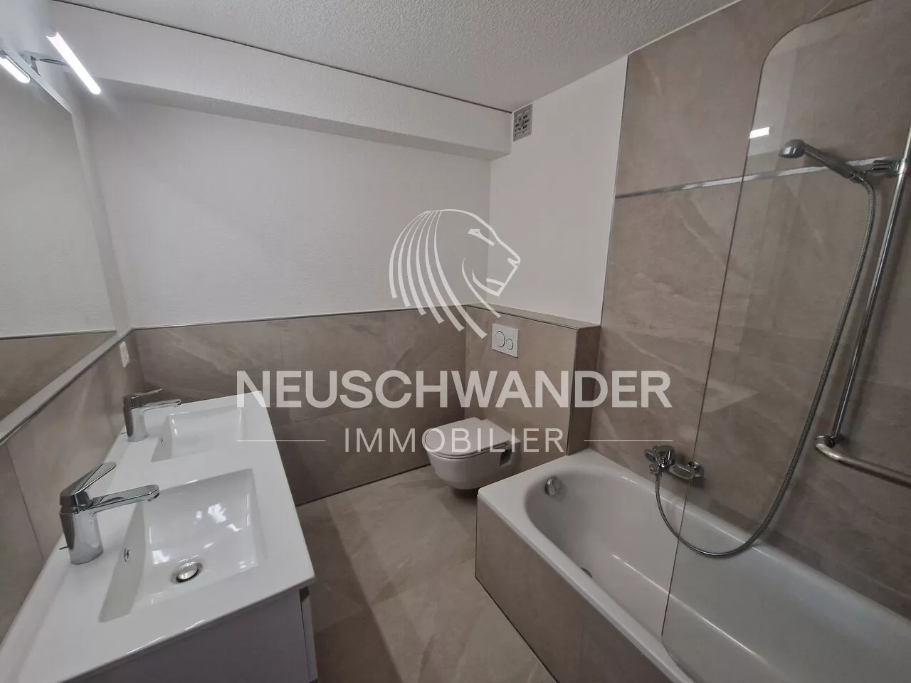 - 1 salle de bain moderne avec WC/lavabo double vasque et baignoire