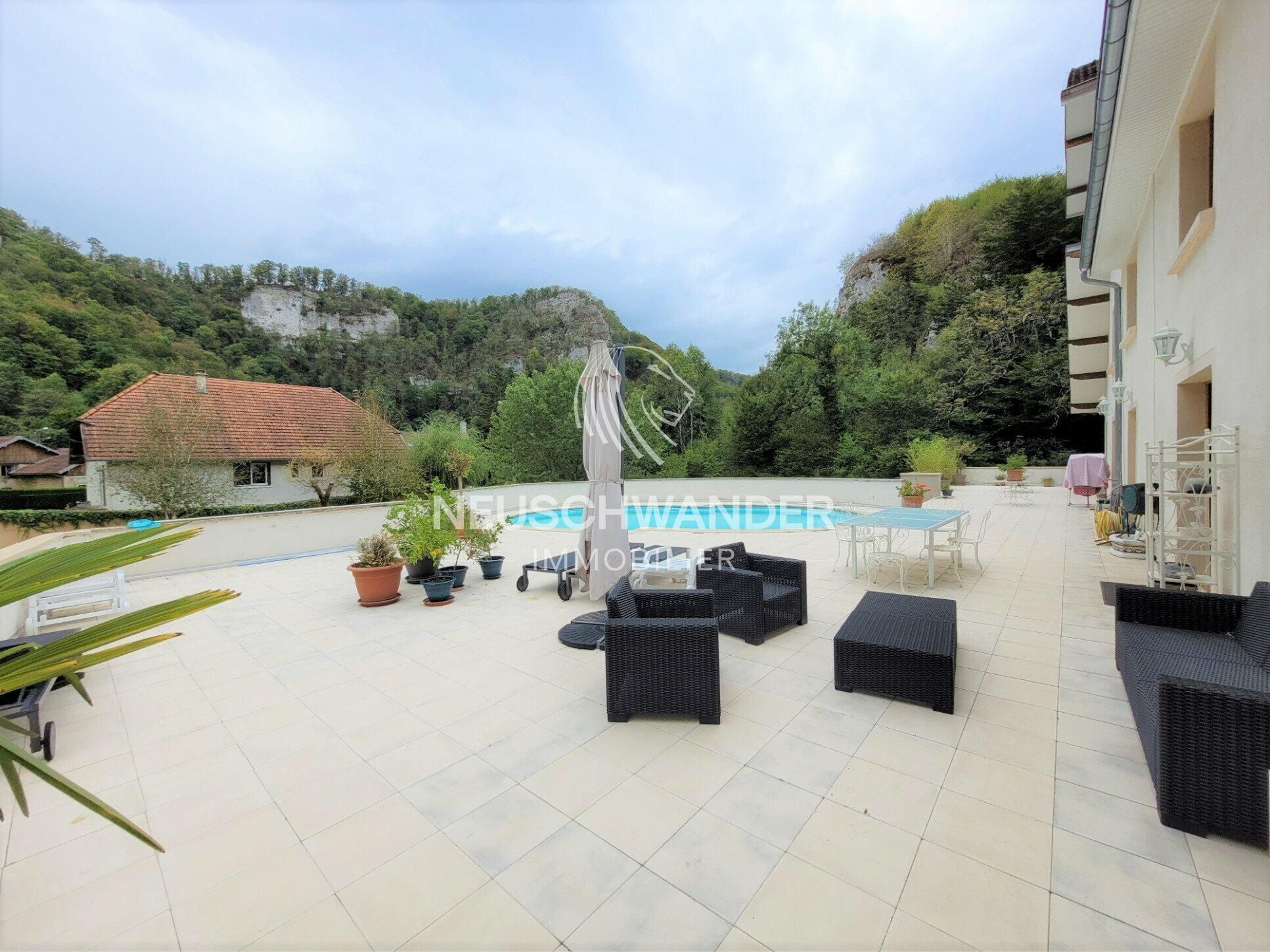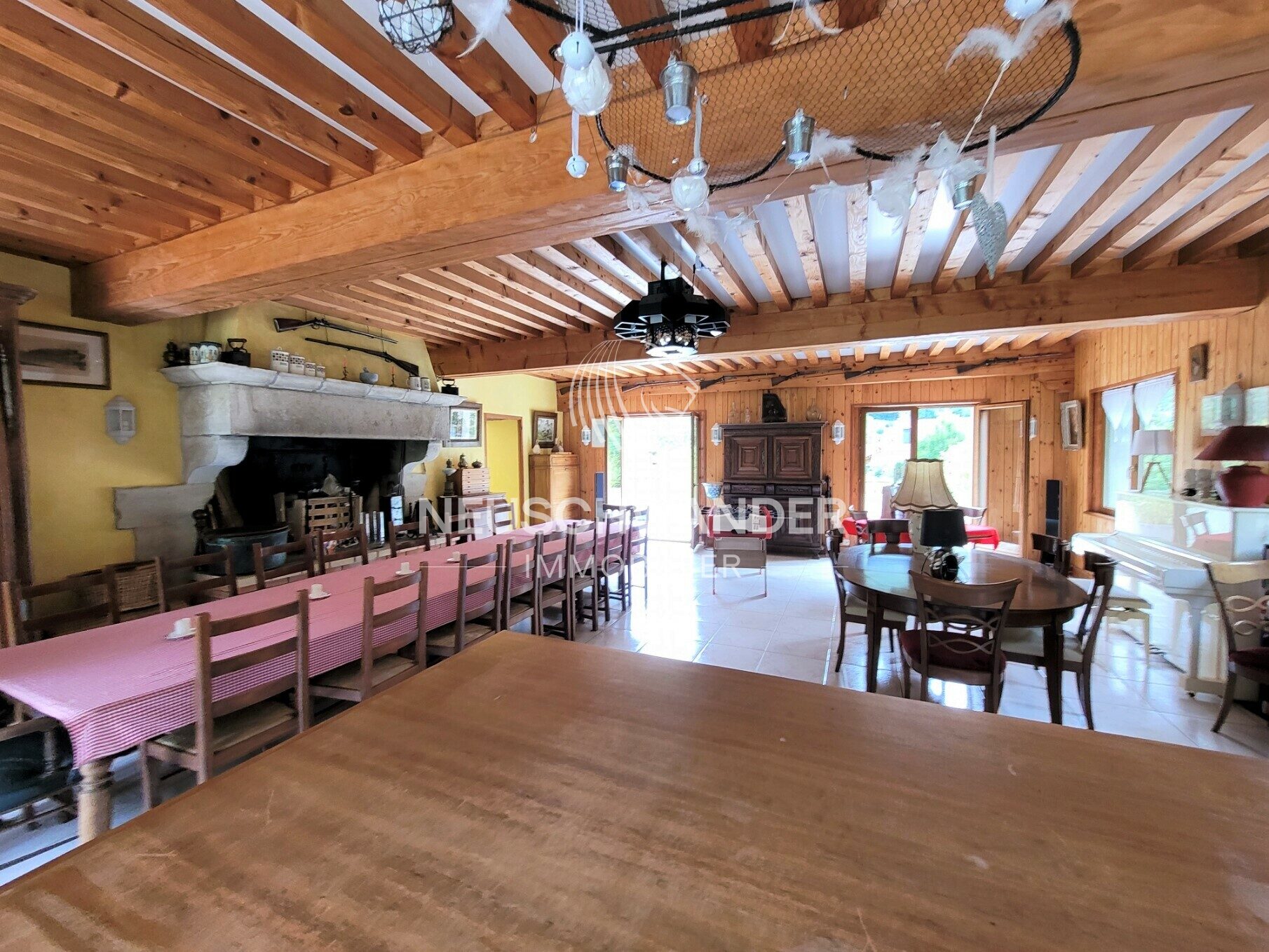 - une cuisine professionnelle, une buanderie, une vaste salle à manger avec cheminée (45 places) et plusieurs terrasses, piscine chauffée….