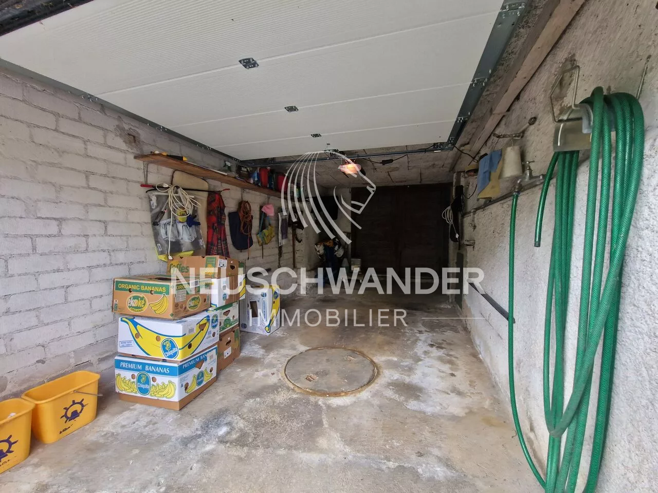 2 doubles (sur la longueur) garages indépendants avec portes automatiques équipés d'électricité et d'eau et un cabanon de jardin accolé à la maison