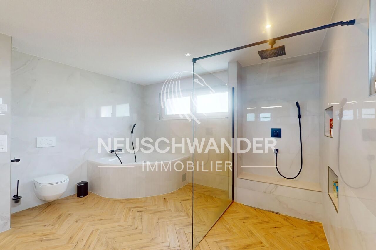 - 1 salle de bains de 14 m2 avec douche, baignoire, WC, lavabos