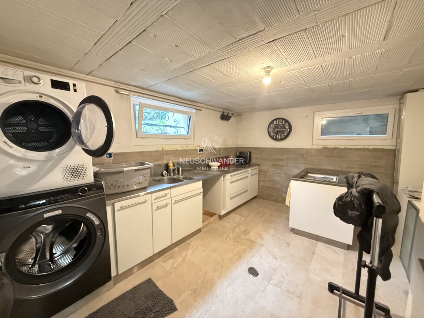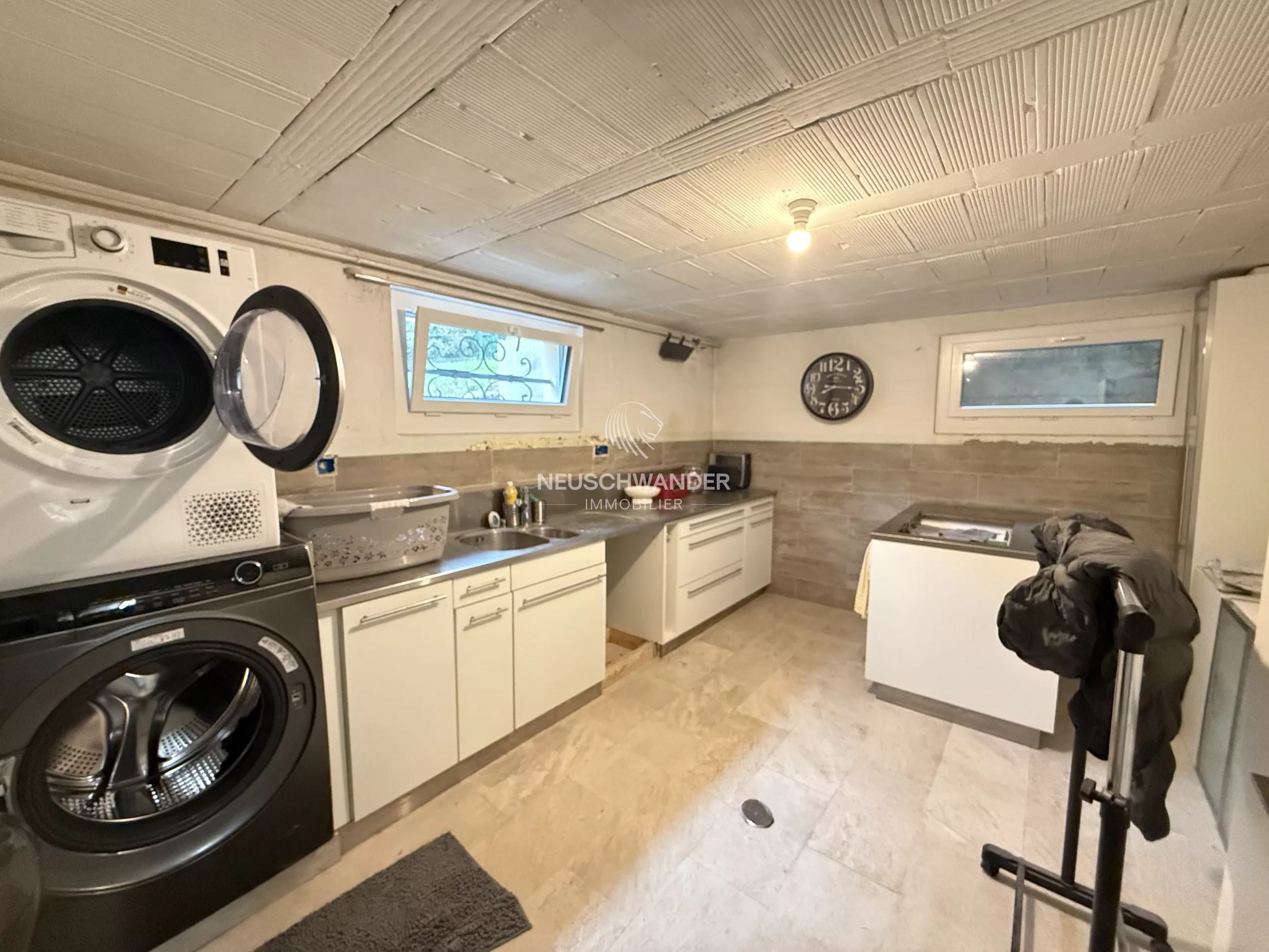 Au sous-sol, vous trouverez une buanderie pratique, une cave, ainsi qu’une grande pièce de rangement offrant de nombreuses possibilités d’aménagement ou de stockage.