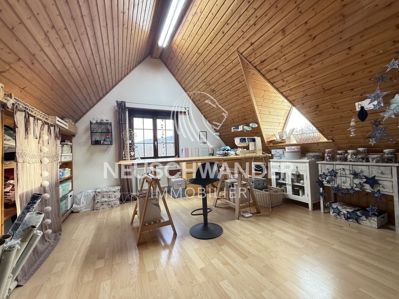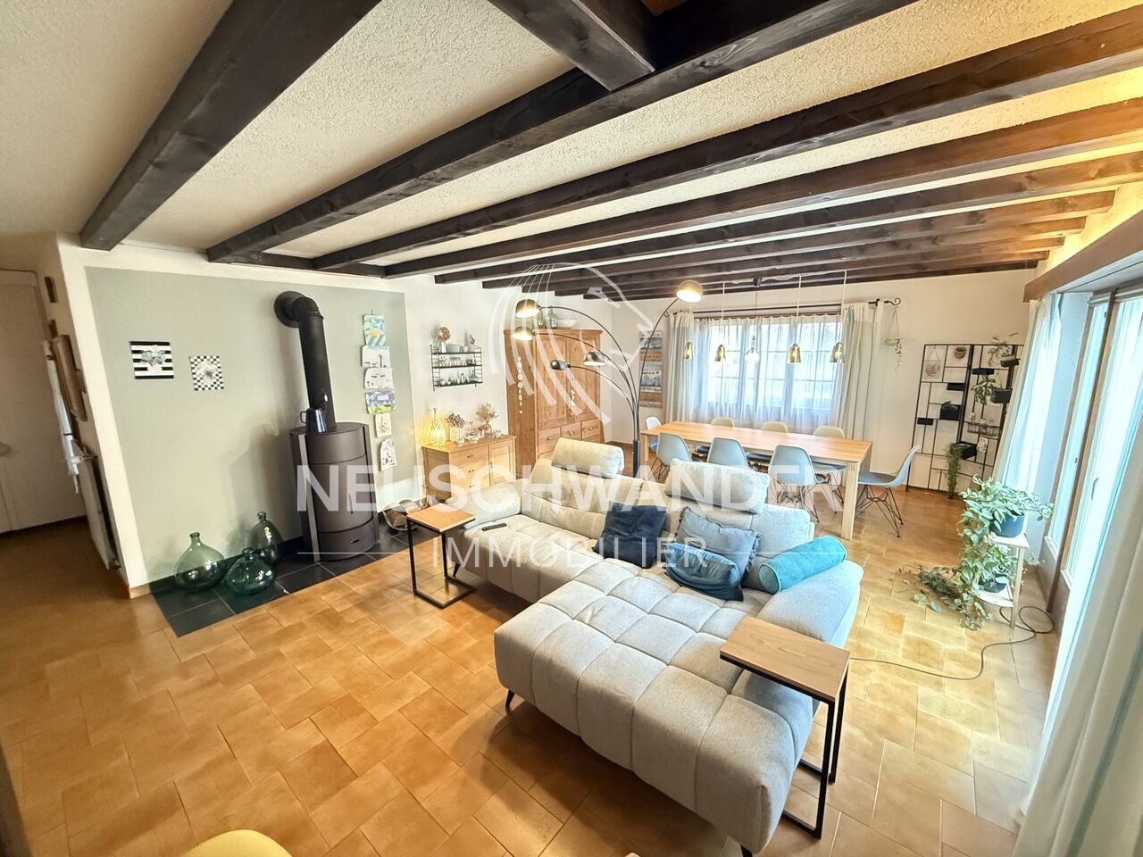 - 1 séjour/salle à manger avec poêle de 34 m²