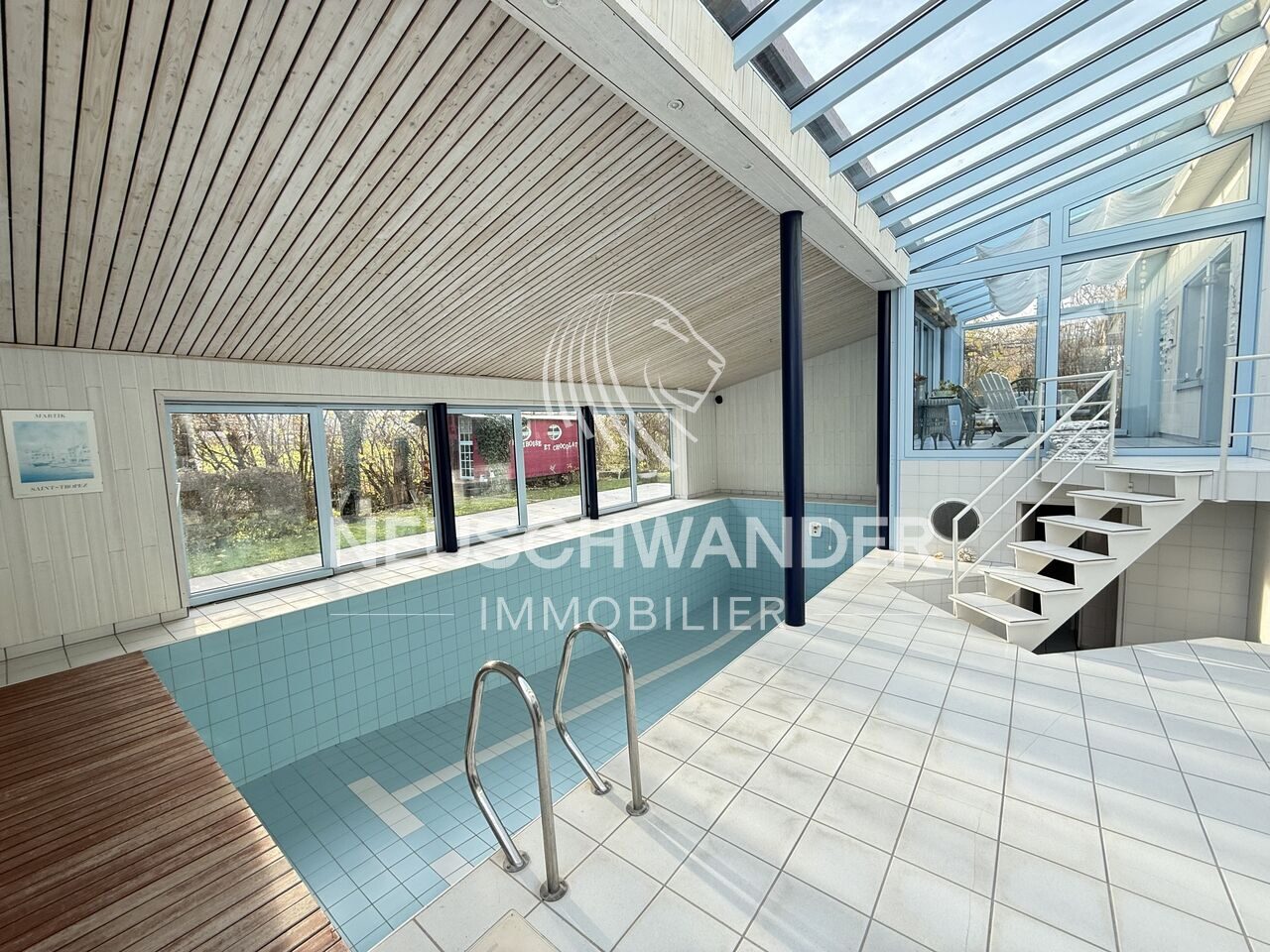 De surcroît, la maison dispose d'une piscine intérieure ouvrant sur la véranda et sur la terrasse grâce à de grandes baies vitrées.