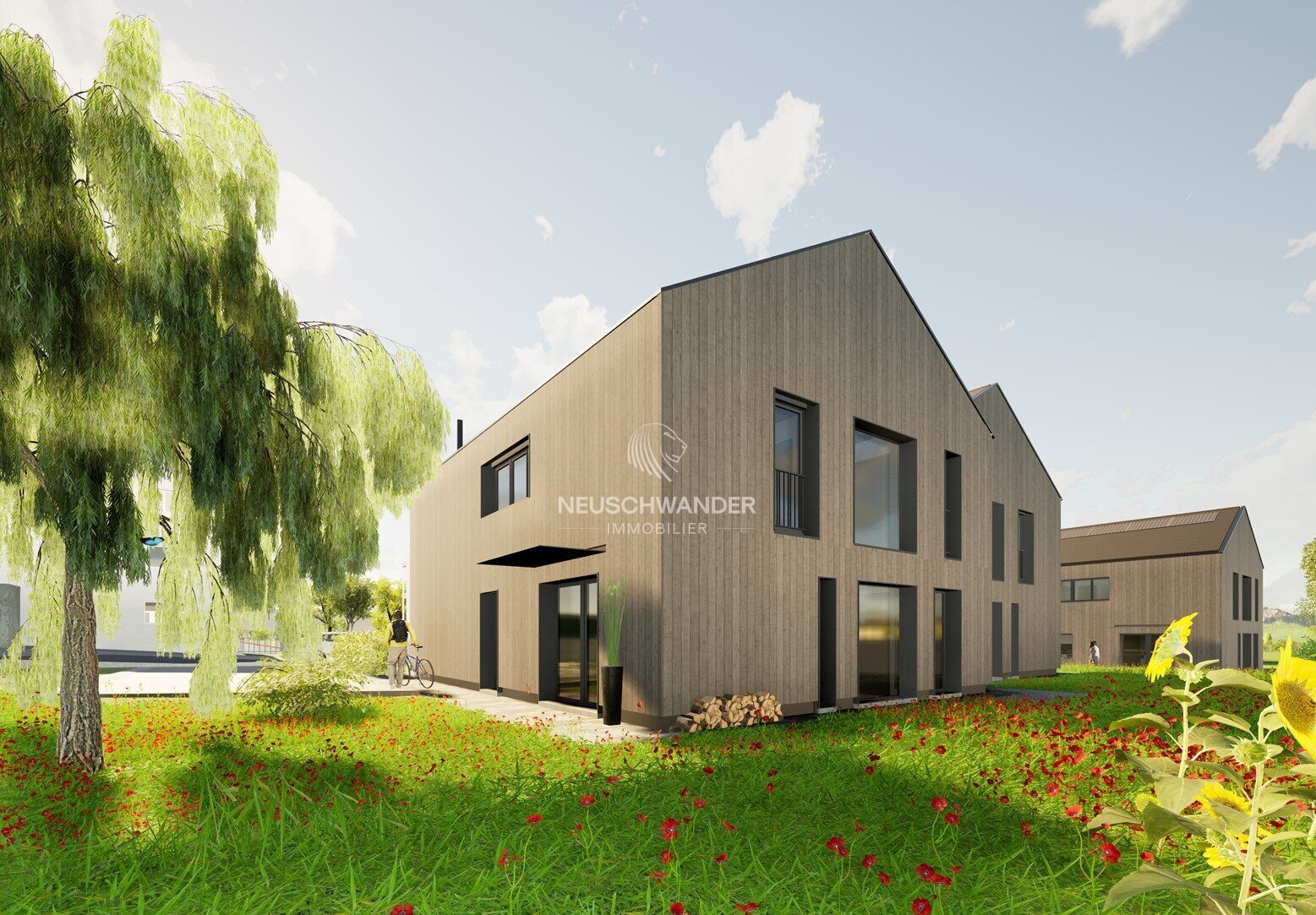 Cette villa jumelée neuve de 145.9 m² séduit immédiatement par son architecture contemporaine et son style chaleureux, avec une façade en bois à bardage vertical et une toiture à deux pans.