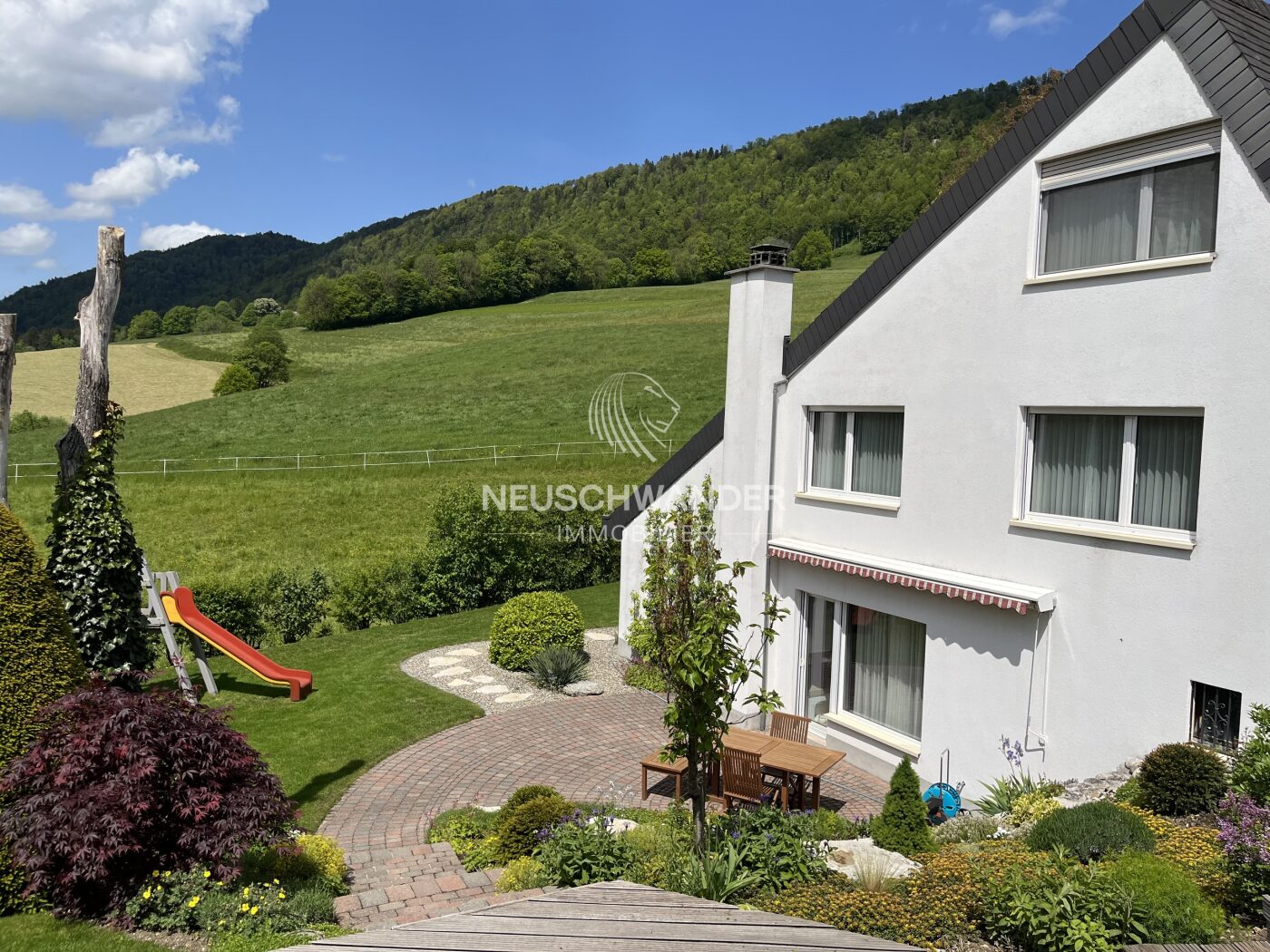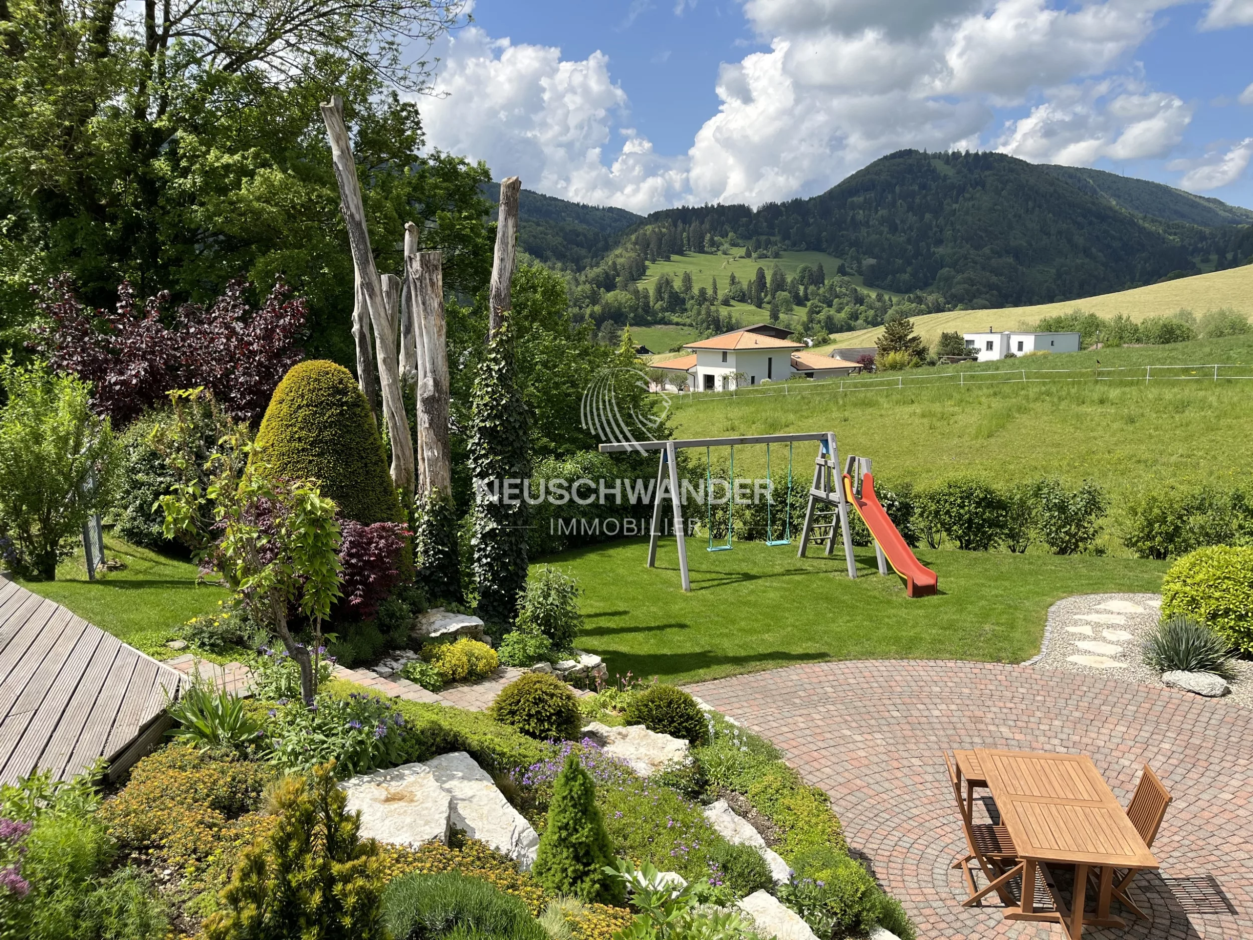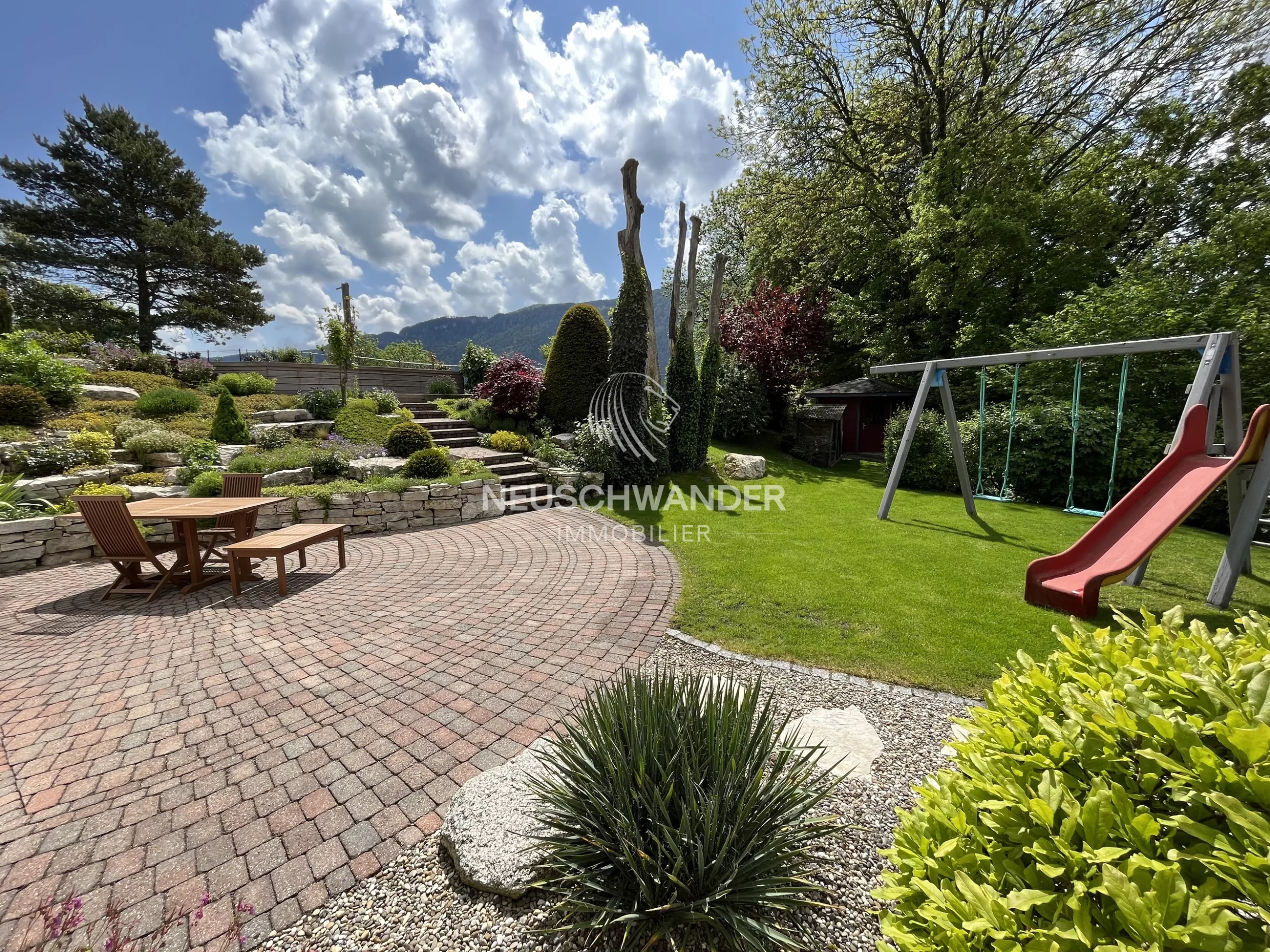 - Côté sud : terrasse avec store extérieur, dallage circulaire, aire de jeux avec balançoires et toboggan, cabanon en bois.