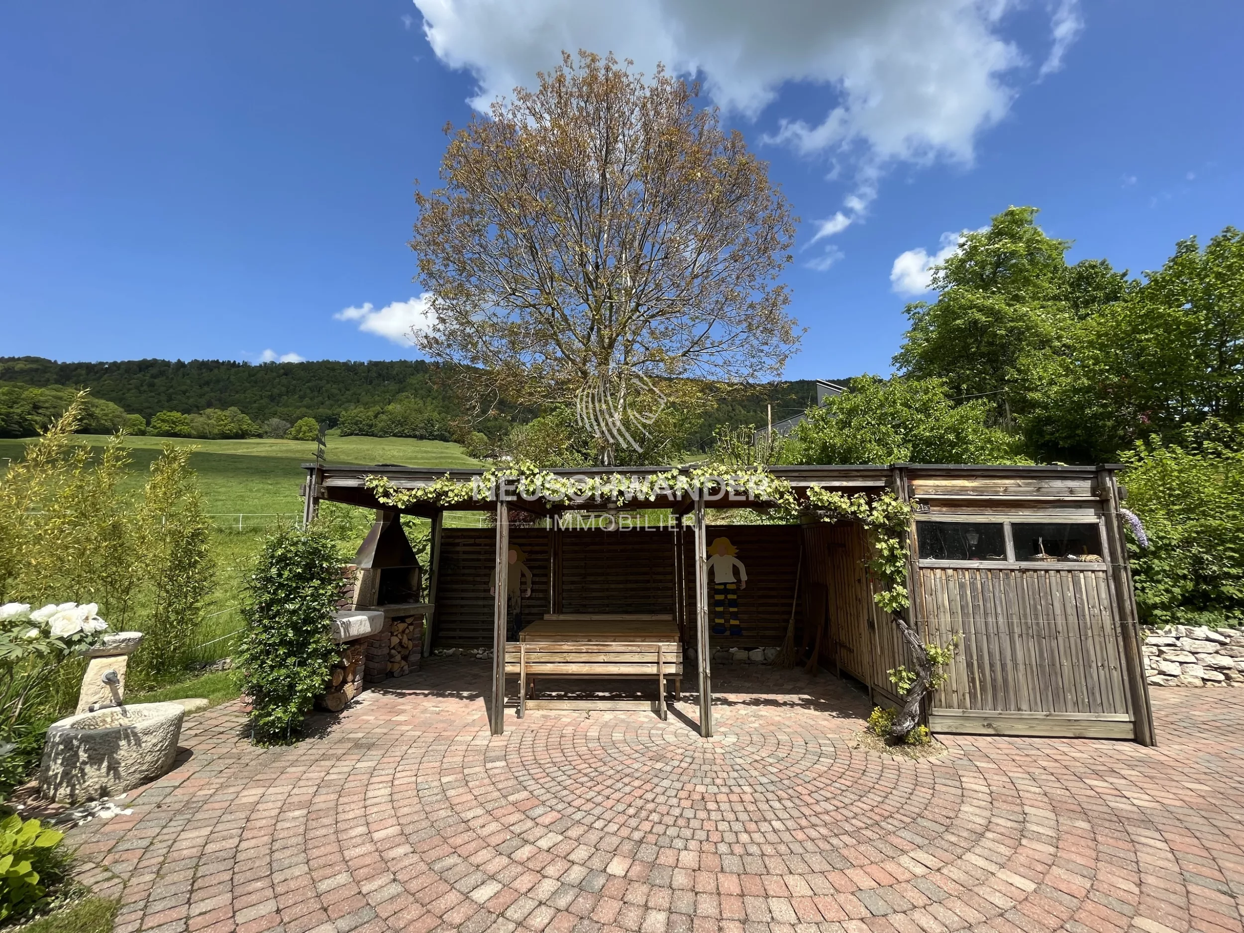 - Côté nord-ouest : pergola couverte avec cheminée-grill, lavabo en pierre naturelle, réduit pour outils et équipements d’entretien, entourée de vigne, dallage circulaire et fontaine.