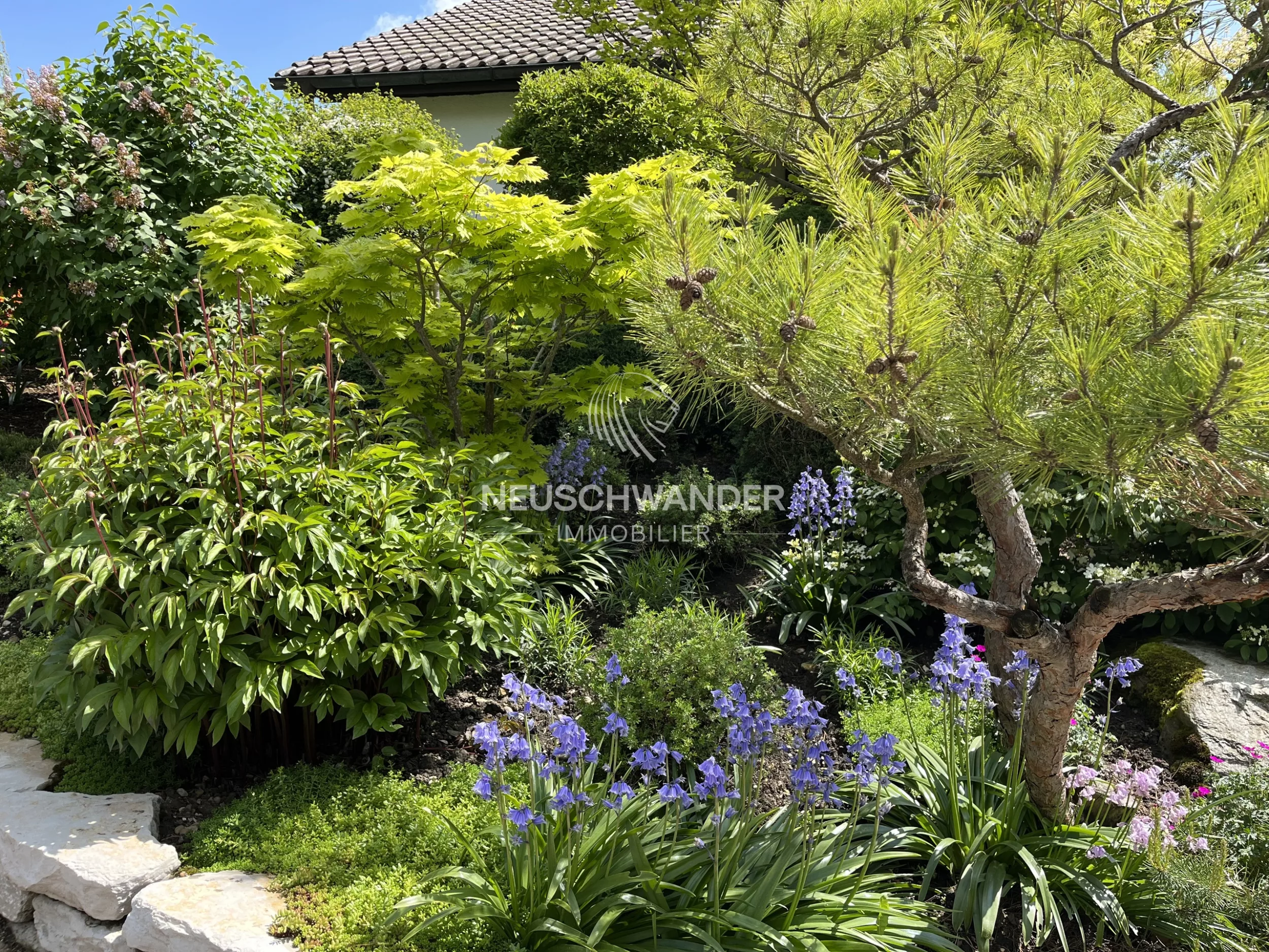 La maison est entourée d’un jardin arboré aménagé en 4 zones distinctes qui lui confère une atmosphère apaisante.