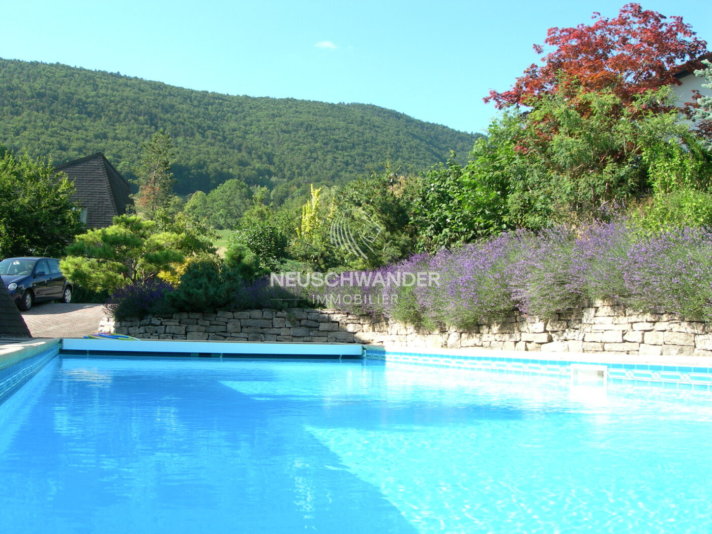 - Côté est : jardin de rocaille avec escaliers menant à la piscine de 10 x 4 m, sol en teck ventilé.