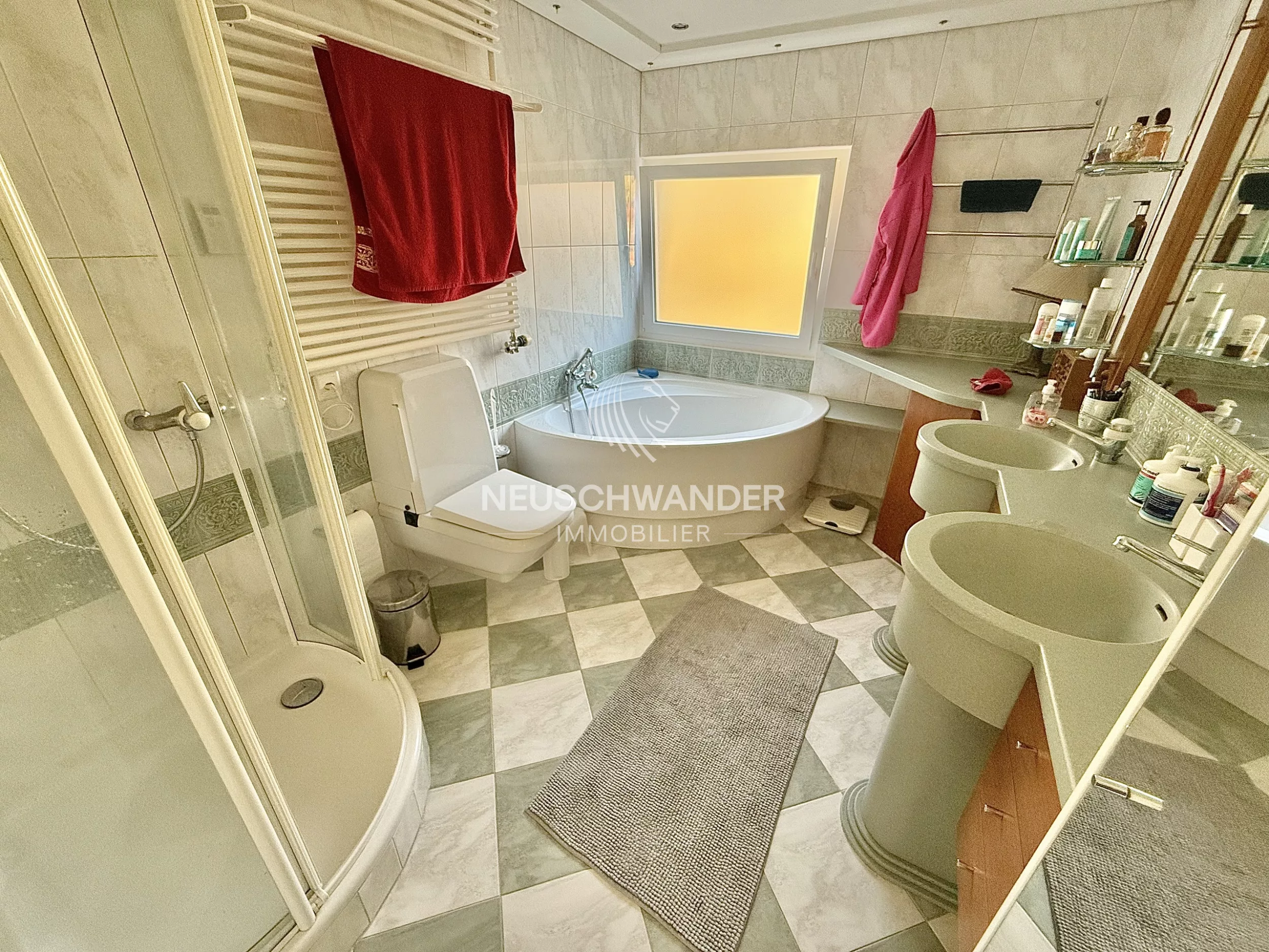 - 1 salle de bain avec double vasques, baignoire, douche, WC et rangements encastrés de 7.90 m²