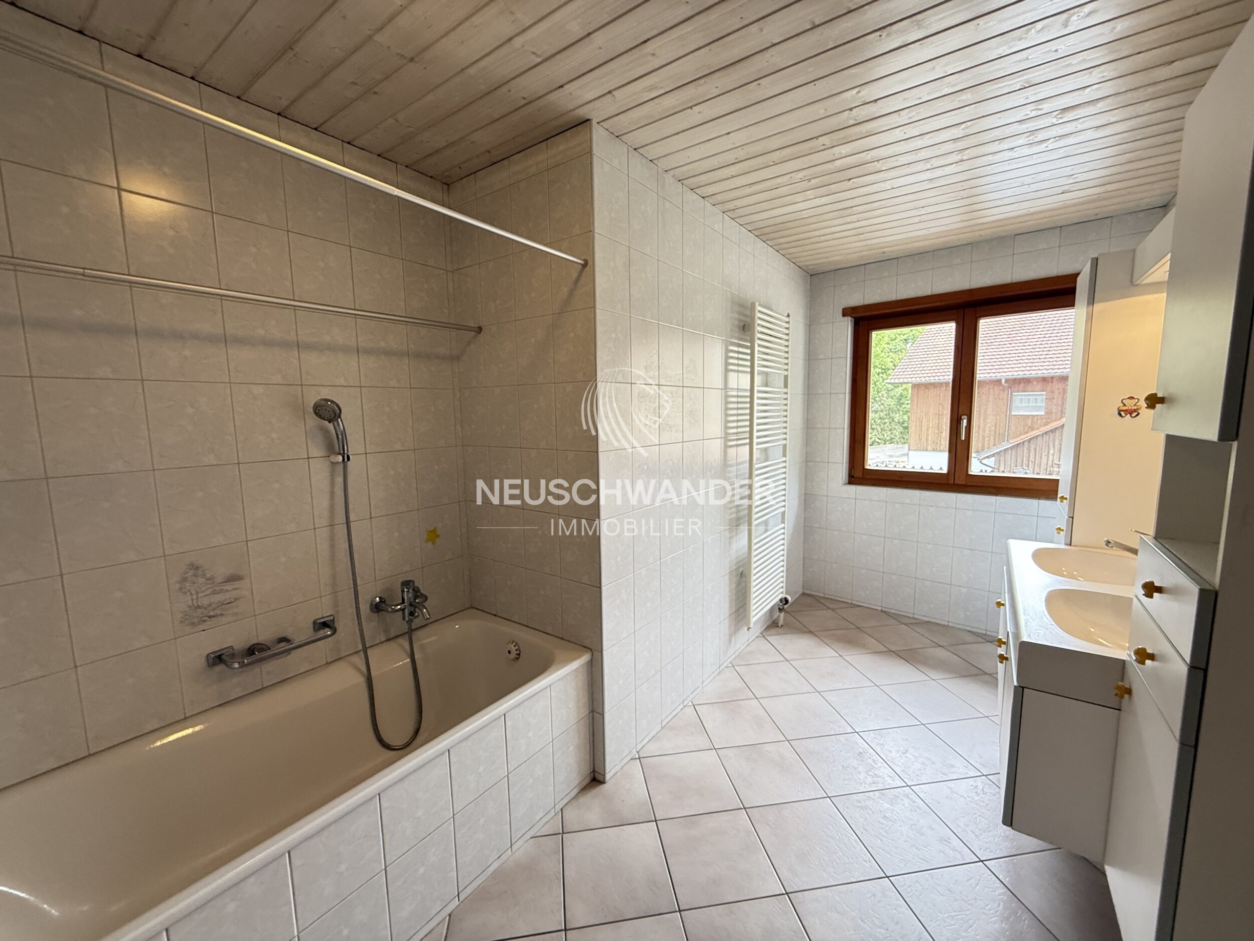 - 1 salle de bain avec douche, baignoire, WC, lavabo et fenêtre